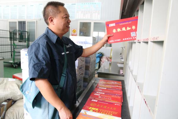 王勇师傅今年已经45岁了,他负责高考录取通知书投递已有5个年头,每逢通知书投递,王勇师傅慎之又慎,他说高考录取通知书是自己人生中的第一份答卷,也是一个新的起点,投递高考录取通知书也是投递一份喜悦,他打心眼里为同学们高兴。他还高兴地说,自己女儿的高考录取通知书也是自己亲手送出的,如今女儿都在念大三了。