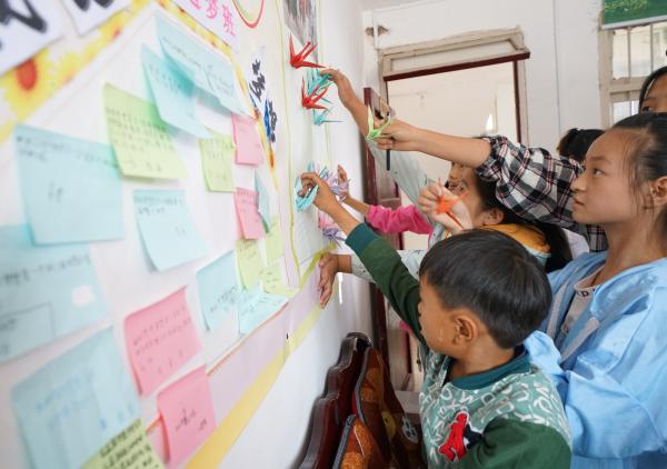 争相把千纸鹤贴上梦想栏,一起放飞梦想 韩静桦摄