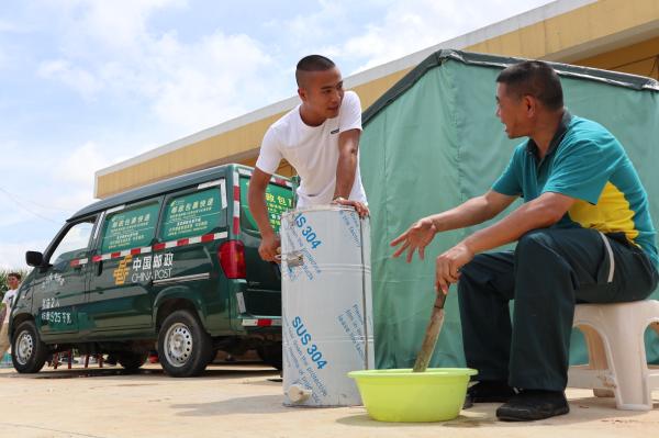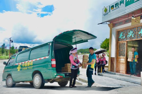 在同样绿意葱茏的黔南州都匀市螺蛳壳山,海拔1400多米的大山间,中国十大名茶之一都匀毛尖的原产地毛尖镇就位于此。绿色邮车载着都匀市分公司包裹快递业务部主任彭琦和城东揽投部主任陆剑波,在蜿蜒曲折的山路上盘旋了一个多小时。最忙的春茶季节已过,此行他们是应合作伙伴宏天福茶厂老板饶宗海之约,来谈深入合作细节的。