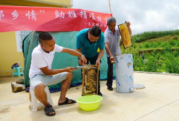 白云在瓦蓝的天空流动,土黄色的蜂箱散布翠绿的桃林间,不远处,安顺市普定县分公司电商管理员陈发阳和新堡村蜂农吴小波正忙着,长长的尖刀割去白色的蜂蜡,粘稠透亮的蜂蜜拉成丝流出来,甜蜜的香味引来不少飞舞的蜜蜂。“蜜的品质越来越好啦!”“有你们帮着,我们制蜜的工艺改进了,品质和产量都有提升!”吴小波乐呵呵的,笑得比蜜还要甜。