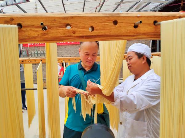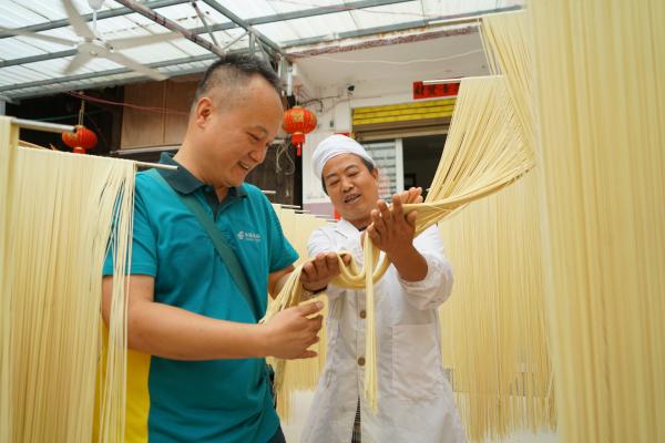 香飘心间的还有黔东南州凯里市下司镇德新新村,延续数百年的古镇盛产独特的下司面。阳光下,金黄的面条映衬着蓝天,垂下丝丝细细的帘幕,天然的麦香引人馋虫大动。“这套设备好,咱古镇的小作坊也要向现代化迈进!”在麦穗康面条加工厂,凯里市公司电商管理员吴刚和村民潘治红聊得不亦乐乎。潘治红家的下司面搭上邮政电商快车,刚上线10天就销售了2000多斤。随着邮政电商的对外推广,线上线下销量猛增。今年5月又投资设备改良工艺,日产能可达3000斤,形成规模化生产。潘治红夫妇还聘请贫困乡亲到厂里加工面条,带动乡亲们一起脱贫致富。