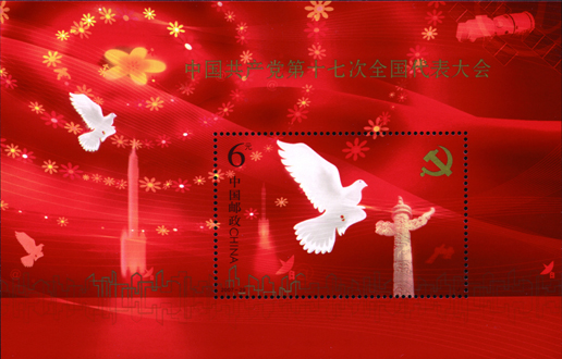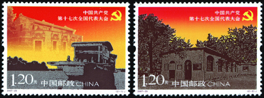 中国共产党第十七次全国代表大会于2007年10月15日至21日在北京召开。大会主题是:高举中国特色社会主义伟大旗帜,以邓小平理论和“三个代表”重要思想为指导,深入贯彻落实科学发展观,继续解放思想,坚持改革开放,推动科学发展,促进社会和谐,为夺取全面建设小康社会新胜利而奋斗。该套邮票由陈幼林、王戈设计,于2007年10月15日发行。