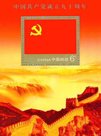 为庆祝中国共产党成立九十周年,2011年7月1日,中国邮政发行《中国共产党成立九十周年》纪念邮票一套6枚,分别表现了中国共产党在九十年间所经历的6个重要阶段:开天辟地、烽火岁月、执政创业、改革大潮、世纪跨越、科学发展。该套邮票由郝旭东设计。
