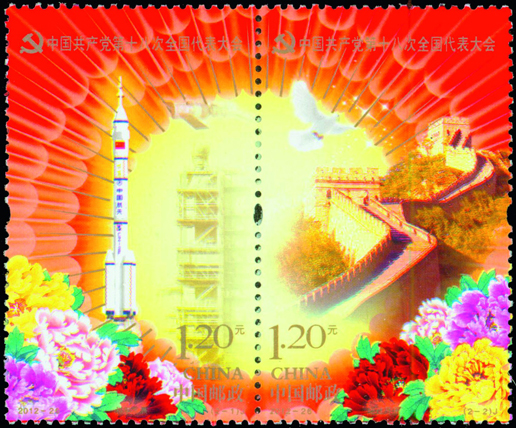 中国共产党第十八次全国代表大会于2012年11月8日在北京人民大会堂召开。此次大会是我们党在全面建设小康社会的关键时期和深化改革开放、加快转变经济发展方式的攻坚时期召开的一次十分重要的会议,是全党全国各族人民政治生活中的一件大事,对我们党高举中国特色社会主义伟大旗帜,团结带领全国各族人民继续全面建设小康社会、坚持科学发展、加快推进社会主义现代化、开创中国特色社会主义事业新局面具有重大而深远的意义。党的十八大代表名额共计2270名,这些代表由全国40个选举单位选举产生。党的十八大选举出了新一届的中共中央领导层。为纪念中国共产党第十八次全国代表大会的召开,中国邮政发行纪念邮票一套2枚,小型张1枚。该套邮票由许开强、饶鉴设计,小型张由郝旭东设计,于2012年11月8日发行。