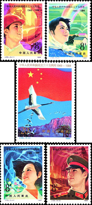 为庆祝中华人民共和国成立35周年,发行纪念邮票一套5枚,图案分别为:壮丽的图景、希望的田野、光辉的前程、科学的春天、保卫你!祖国。该套邮票由陈晓聪设计,于1984年10月1日发行。