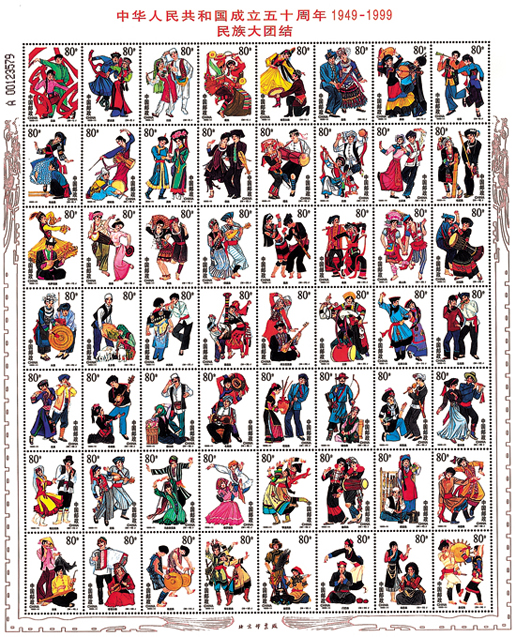 《中华人民共和国成立五十周年—民族大团结》邮票是迄今为止我国发行枚数最多的一套邮票,全套56枚,表现了56个民族身着民族盛装、载歌载舞,迎接共和国五十周年大庆的场景。该套邮票由周秀青、金向设计,于1999年10月1日发行。