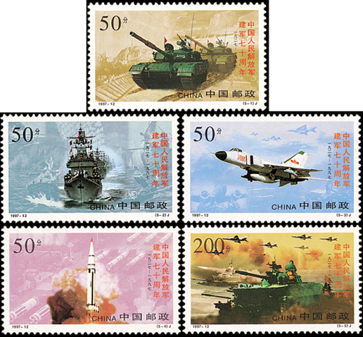 1997年8月1日,中国邮政发行了《中国人民解放军建军七十周年》纪念邮票一套5枚,票名分别是“陆军”“海军”“空军”“战略导弹部队”和“陆海空联合作战演习”。该套邮票一改过去以人为主的模式,着重展示了我军精良的现代化装备,由季宏敏、姚斌、骆根兴、李翔设计。