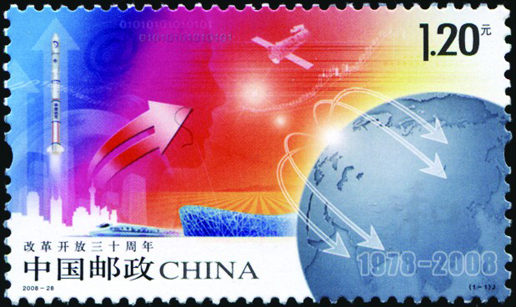 2008年12月18日,为纪念改革开放30周年,国家邮政局发行了《改革开放三十周年》纪念邮票一套一枚。邮票名为“腾飞”,画面由多种相关元素构成:地球意在表现全球化的概念,象征着中国融入了世界大家庭;以“神舟七号”宇航员出舱及高速行驶的“和谐号”列车,以及“鸟巢”、箭头和一些电子符号的迭次出现,勾画出一幅改革浪潮在举国上下全面推进的壮美画卷。背景中透叠的人像眼睛,寓意改革开放以人为本的理念以及30年来人们思想解放和观念的改变。这是30年改革的重要成果,也是改革大业得以进行的思想基础。该套邮票由王虎鸣设计,于2008年12月18日发行。