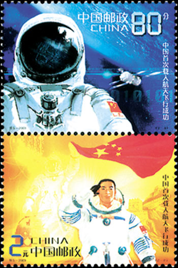 2003年10月16日,为纪念我国首次载人航天飞行成功,中国邮政特别发行了《中国首次载人航天飞行成功》纪念邮票1套2枚。第一枚为“英姿”,画面主图为身着宇航服的航天员形象,背景为“神舟”五号载人飞船翱翔太空的靓影和深邃浩淼的太空。第二枚为“凯旋”,画面主图为身着宇航服的航天员走出返回舱敬礼时的形象,背景由国旗、长城、宇航员、返回舱和飞船运行轨迹组成。该套邮票由王虎鸣、刘向平设汁。