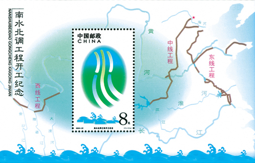 南水北调工程属于发展中国经济的里程碑式工程。我国南北水资源的分布极为不均,南方气候湿润,水资源充足,而北方却干燥干旱,黄土高原便是一个明显的例子,然而我国大量重工业却在北方,因此开启南水北调工程,将长江水引入黄河各分支,可达到协调水资源的效果。为了纪念工程开工,中国邮政发行《南水北调工程开工纪念》邮票小型张1枚,由陈楠设计,于2003年9月26日发行。