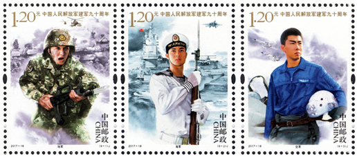 2017年8月1日,中国邮政发行《中国人民解放军建军九十周年》纪念邮票一套6枚,小型张1枚。图案内容分别为:陆军、海军、空军、火箭军、战略支援部队、武装警察部队,小型张内容为听党指挥。该套邮票展现了中国人民解放军的飒爽英姿和中国军事作战装备的硬件实力,主题鲜明,磅礴大气,画面具有强烈的动感和威严的气势。小型张上军旗飘扬,各军种英姿飒爽,背景衬托各军种高尖端装备,描绘了我军战士联合作战的画面,既表现了中国人民解放军威武雄壮的军容和现代化水平,也表现了在党的指挥下,人民军队忠实履行保卫祖国、捍卫和平的神圣使命。该套邮票的设计者为李翔、李晨、仓亭亭、刘伟、沈璐。