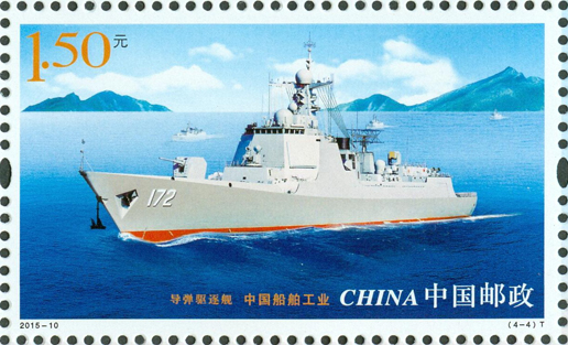 2015年6月3日,中国邮政发行《中国船舶工业》特种邮票1套4枚,内容分别为航天测量船、薄膜型液化天然气运输船、海上浮式生产储油船、导弹驱逐舰。该套邮票遴选了代表我国造船先进水平的、不同类型的船舶,以横向陈列的方式展示了船舶优美的形态和庞大的规模。画面气氛的营造不仅突出船舶工作的环境,还强调船舶在现代化建设中所承担的功能。邮票画面整体布局均衡、协调,层次清晰,空间感强。该套邮票由史渊设计。