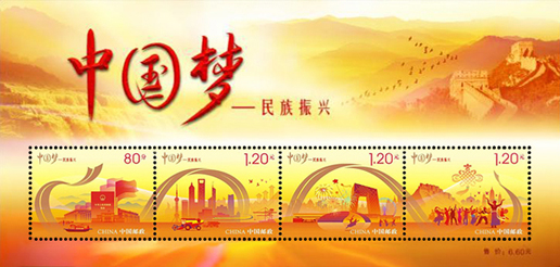 2014年9月20日,中国邮政发行《中国梦—民族振兴》特种邮票一套4枚,小全张1枚。邮票内容分别为政治文明、经济发展、文化繁荣、民族团结。该套邮票由何洁、周岳、陈楠设计。