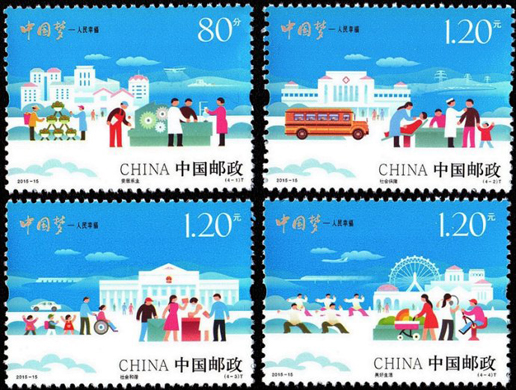 2015年7月25日,为深入揭示“中国梦”的本质内涵,进一步弘扬中国精神,凝聚中国力量,中国邮政发行了《中国梦—人民幸福》特种邮票一套4枚。邮票内容分别为安居乐业、社会保障、社会和谐、美好生活。该套邮票画面以蓝天为背景,通过一幅幅插画描绘出一派和谐祥和的场景,营造出一幅人民幸福的美好愿景,艺术地反映了“中国梦—人民幸福”的主题。该套邮票由何洁、周岳设计。