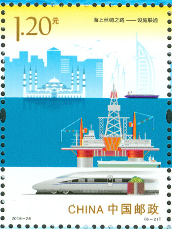 2016年9月10日,中国邮政发行《海上丝绸之路》特种邮票一套6枚,小全张1枚,邮票内容分别为:政策沟通、设施联通、贸易畅通、资金融通、民心相通、海上交通。该套邮票采用六枚联票形式设计,以画面中部的海平面进行串联,将画面分割为前景主题与背景。小全张边饰以海洋为背景。晨光初现,灯塔指引的灯光尚未熄灭,一轮红日由海平面冉冉升起,喻示着21世纪海上丝绸之路的崭新开始与光明前景。该套邮票由何洁、周岳设计。