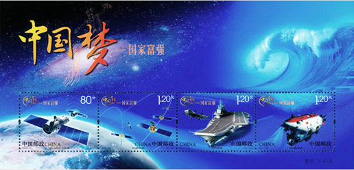 2013年9月29日,中国邮政发行邮票《中国梦—国家富强》特种邮票一套4枚,小全张1枚。邮票内容分别为神舟飞船与天宫一号交会对接、北斗卫星导航系统、辽宁号航空母舰、蛟龙号载人潜水器。该套邮票展现了神十、北斗、蛟龙、航母四个方面的伟大成就,体现了国家富强、社会关注的焦点。该套邮票由何洁、周岳设计。