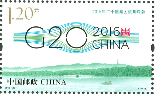 二十国集团(G20)领导人第十一次峰会于2016年9月4日至5日在浙江省杭州市举办,这是中国首次主办二十国集团峰会。中国邮政于2016年8月27日发行《2016年二十国集团杭州峰会》纪念邮票1套1枚,杭州峰会会标图案由20根线条勾勒出一个桥形轮廓,寓意二十国集团已成为全球经济增长之桥、国际社会合作之桥、面向未来的共赢之桥。该套邮票由何洁、孟梦设计。