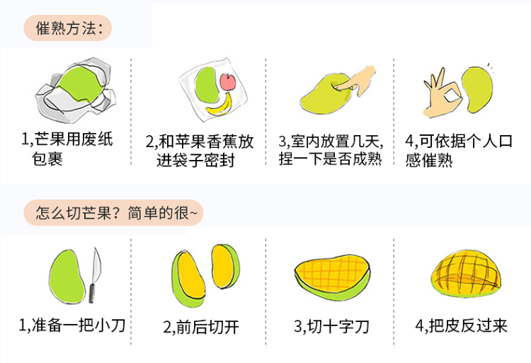 您收到的台芒都是现采摘的青皮状态,为七八成熟,这是为了保证运输过程不受损坏,还需要你参照如下方法常温放置几天,待外观变黄,质地变软,即可享用~