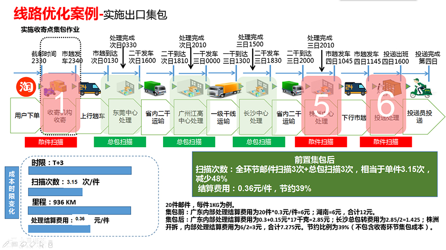邮路要怎么捋?就是要以和竞争对手对标为任务,对每条线路从收寄到投递进行全环节梳理、全链路优化。以广东东莞—湖南株洲线路为例:这条线路目前日均包件量1000件,在全散件模式下,由于没有直达邮路,邮件从收寄到投递,每个邮件全程需经过6次散件分拣,11次散件装卸搬运,时限T+3。通过全环节捋、全流程捋、各环节优化,改为在东莞实施前置集包,散件在收寄网点直接分拣封入株洲总包,同时开通东莞—株洲直达邮路,邮件由原来在东莞—广州—长沙—株洲间散件装卸,优化为东莞—株洲总包装卸。通过这两种优化措施的结合,邮件由散件分拣6次、装卸搬运11次,将变为散件分拣3次、总包分拨3次、装卸搬运7次,减少了广州和长沙的4次总包装卸作业,处理结算费用降低39%,装卸效率大幅提升;时限水平由T+3将减少为T+1,达到次日递,超过主要竞争对手;全程运输里程从936公里将缩短为720公里,减少了23%,节约了运输成本。此外,在该线路日均邮件量较少的情况下,可以采取组开深圳—东莞—株洲串行直达的运输方式,在提高车辆装载率的同时,实现当天收寄的东莞—株洲邮件和18点前收寄的深圳—株洲邮件全程时限T+1。