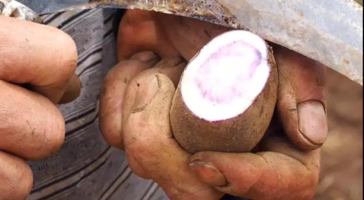 产出的洋芋个个都是深紫色的,而切开后发现,紫色还渗透进了内里,一圈一圈犹如光晕一般,叠加着、包裹着。