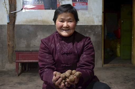 耿淑娥热情地请记者吃她种的核桃。 记者 吕磊 摄