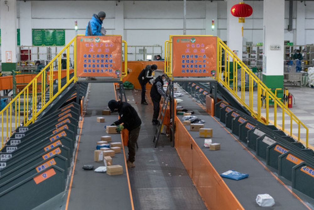 记者看到,在工作台后,几位身着中国邮政制服、佩戴口罩的工作人员分工明确,有序工作。有的人负责打包物品,有的人负责称量包裹,还有的人正将贴好快递单的邮件搬运上货车。
