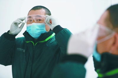 出发前,侯毅在衣冠镜前整理着装并检查自己的个人防护装备是否佩戴到位。