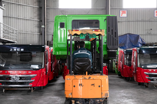 重庆邮政员工孙西满正驾驶着叉车装运上汽红岩重卡配件。 朱亚坤 摄