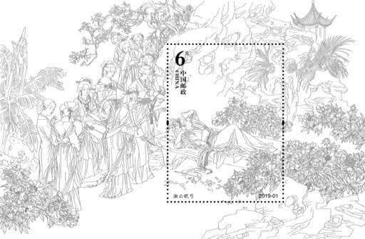 萧玉田没少花心思,他认真推敲构图,反复调整后,将小型张中心设计为邮票画面,打上齿孔后是可以独立出来又相对完整的只有一个人物的“湘云醉眠”画面,人物、青石凳、芍药、假山等构成元素应有尽有,假山下部的虚化处理给面值、票名等文字留出了位置。齿孔内的主体人物湘云及背景与齿孔外面的宝玉一众人、芍药、树木、假山等有机组合成“S”形构图,又是一幅大景观、多人物整体协调的“湘云眠芍”作品,齿孔内外既相互独立又整体统一,可分可合。