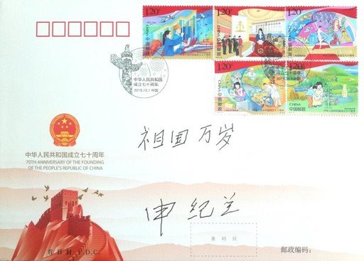 2019年10月,申纪兰在《中华人民共和国成立七十周年》首日封上题字。