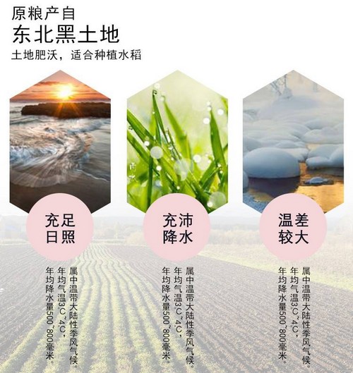 吉林地处北纬41-46°拥有肥沃的黑土地,长白山源头水灌溉,是世界唯一“黄金水稻生产带”。日照充足、水源优质、肥沃黑土、气侯适宜孕育出中国最为优质的吉林大米。