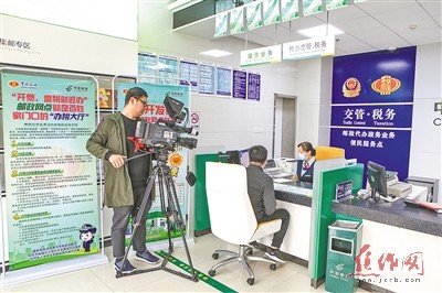 图为中央电视台记者在市邮政分公司龙源湖邮政支局采访“税邮双代”业务。王成 摄
