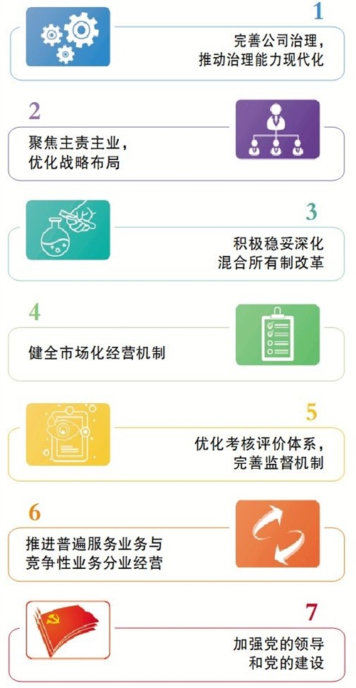 2.七个方面重点改革任务。《实施方案》根据中国邮政改革落地过程中遇到的重点难点问题,提出:一是完善公司治理,推动治理能力现代化,全面贯彻“两个一以贯之”,把党的领导融入公司治理各环节,实现制度化、规范化、程序化,加强董事会建设,落实董事会职权,保障经理层依法行权履职,开展对标世界一流企业管理提升行动,加强各类风险管控,完成子企业公司制改制。二是聚焦主责主业,优化战略布局,围绕服务国家战略,构筑中国邮政高质量发展的“四梁八柱”,推动普遍服务能力提升,推动寄递业务核心竞争力提升,推动邮储银行高质量发展,推动代理金融转型发展,推动中邮保险价值发展,推动农村电商生态圈建设,推动惠农合作项目协同发展,推动资产重组与盘活,推动自主创新能力提升,清理退出不具备竞争优势的非主营业务和低效无效资产,完成剥离国有企业办社会职能,解决历史遗留问题。三是积极稳妥深化混合所有制改革,把握好改革方向,务求改革实效,避免盲目性,避免一混了之。按照完善治理、强化激励、突出主业、提高效率的要求,坚持因地施策、因业施策、因企施策,宜独则独、宜控则控、宜参则参,分层分类深化混合所有制改革,稳慎开展混合所有制企业骨干员工持股,推动混合所有制企业深度转化经营机制,加强对混合所有制改革全过程的监督,防止国有资产流失。四是健全市场化经营机制,强化各层级邮政企业、控股子公司市场主体地位,切实深化劳动、人事、分配三项制度改革,推行经理层成员任期制和契约化管理,全面推进用工市场化,完善市场化薪酬分配机制,稳慎开展控股子公司中长期激励。五是优化考核评价体系,完善监督机制,完善战略绩效考核评价体系,健全协同高效的监督机制。六是认真贯彻落实《关于新时代加快完善社会主义市场经济体制的意见》要求,推进普遍服务业务与竞争性业务分业经营。七是加强党的领导和党的建设,加强党的政治建设,推进党建工作与生产经营深度融合,加强领导班子建设和人才队伍建设,激励领导人员担当作为,持续深入推进全面从严治党。