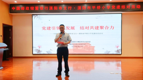 活动现场,邮储银行溧阳市支行党支部书记周炜和平桥小学党支部书记王伟民进行了深入的交流,就今后如何发挥各自行业的资源和人才优势,进行互动交流、优势互补、资源共享达成了共建意向。