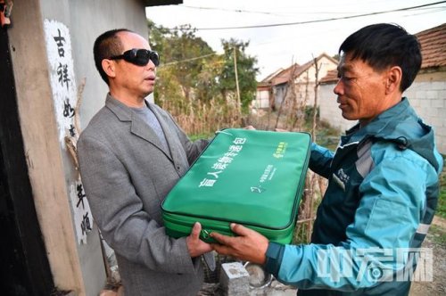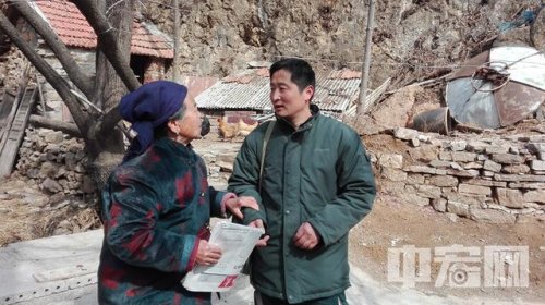 招远邮政霞坞支局投递员李翠祥为黑都坡村盲人送盲人读物邮件