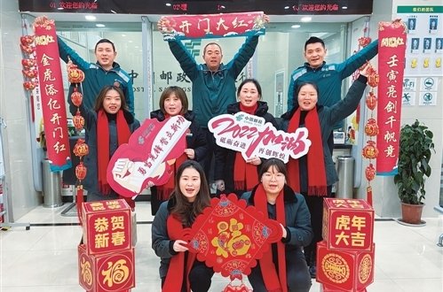喜气洋洋辞旧岁,虎虎生威迎新年。新年伊始,中国邮政广大员工意气风发、豪情满怀,全力开展业务旺季开门红活动,大步迈进推动企业高质量发展的新征程。在推进代理金融业务发展中,重庆市万州片区邮政分公司定下了一个“小目标”:春节前,全区邮政储蓄余额规模要突破200亿元。作为万州邮政代理金融的标杆网点,电报路邮政所员工一展“壬寅亮剑千帆竞,金虎添亿开门红”的对联,积极营造营销氛围,决心在网点储蓄余额破亿元的基础上,再创新业绩。