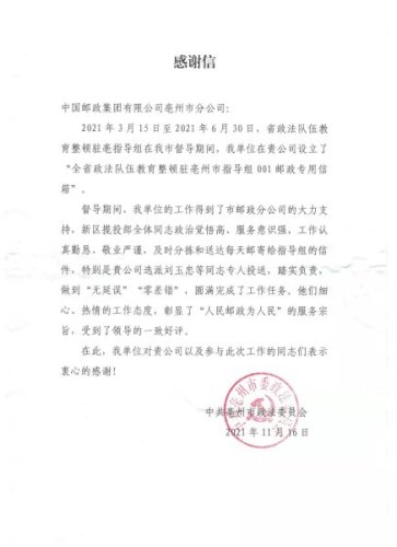 2021年3月15日至6月30日,省政法队伍教育整顿驻亳指导组在亳州督导期间,在亳州邮政申请开通了专用信箱用于接收相关邮件。亳州市分公司新区揽投部政治觉悟高,服务意识强,工作认真勤恳,严谨敬业,每天及时分拣和投递信件,做到“无延误”“零差错”,圆满完成了工作任务。