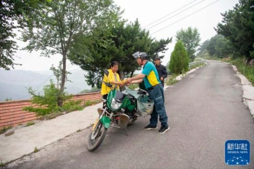 在山西省壶关县大峡谷镇师家背村,赵月芳为村民送件(7月14日摄)。新华社记者 杨晨光 摄