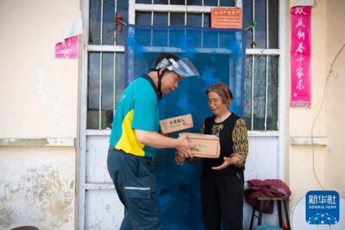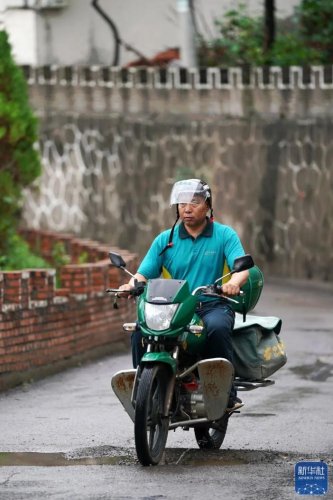 在山西省壶关县大峡谷镇师家背村,赵月芳为村民送件(7月14日摄)。新华社记者 詹彦 摄