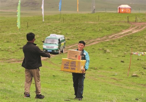 看到邮车来了,牧民迫不及待地迎上去接过自己网购的商品。□《工人日报》记者 王伟伟 摄