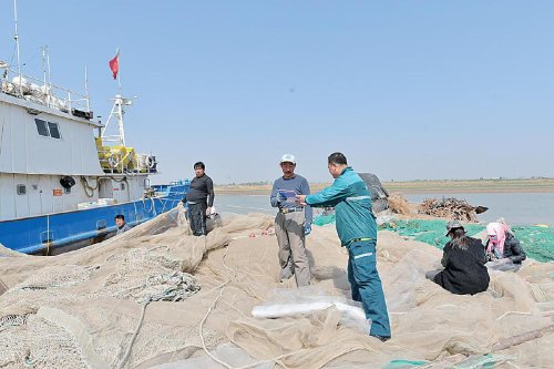 王海进在渔船码头送特快专递。