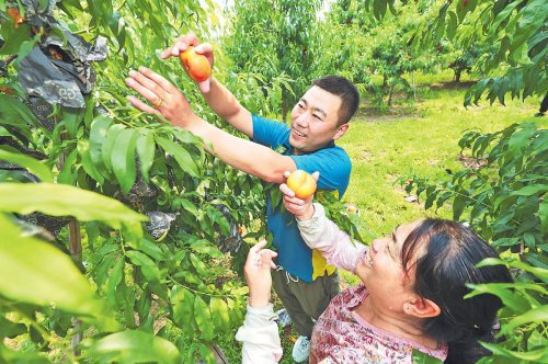 邮政员工与桃农一起采摘鲜桃,共享丰收的喜悦。□万宇 摄