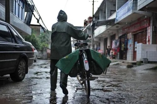这是在江西省铅山县陈坊乡,罗细英冒着大雨骑车出发去送邮件(2011年7月19日摄)。新华社记者 周密 摄