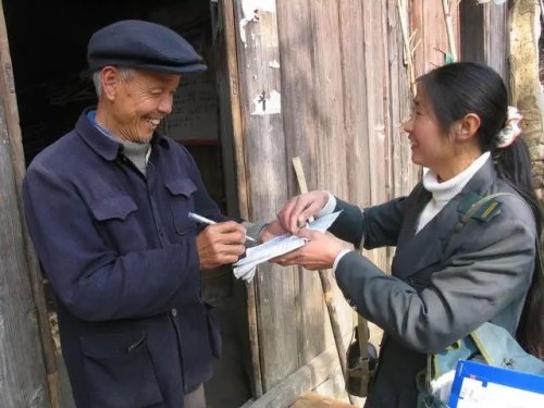 这是在江西省铅山县陈坊乡,罗细英把信件送到居民手中(2007年1月6日摄)。新华社记者 陈春园 摄