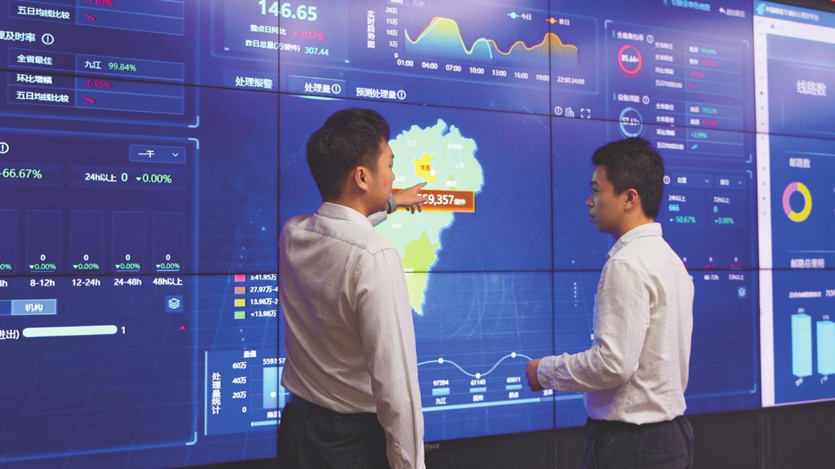 在江西邮政指挥调度中心,值班人员正在商议如何有效执行调度指令。