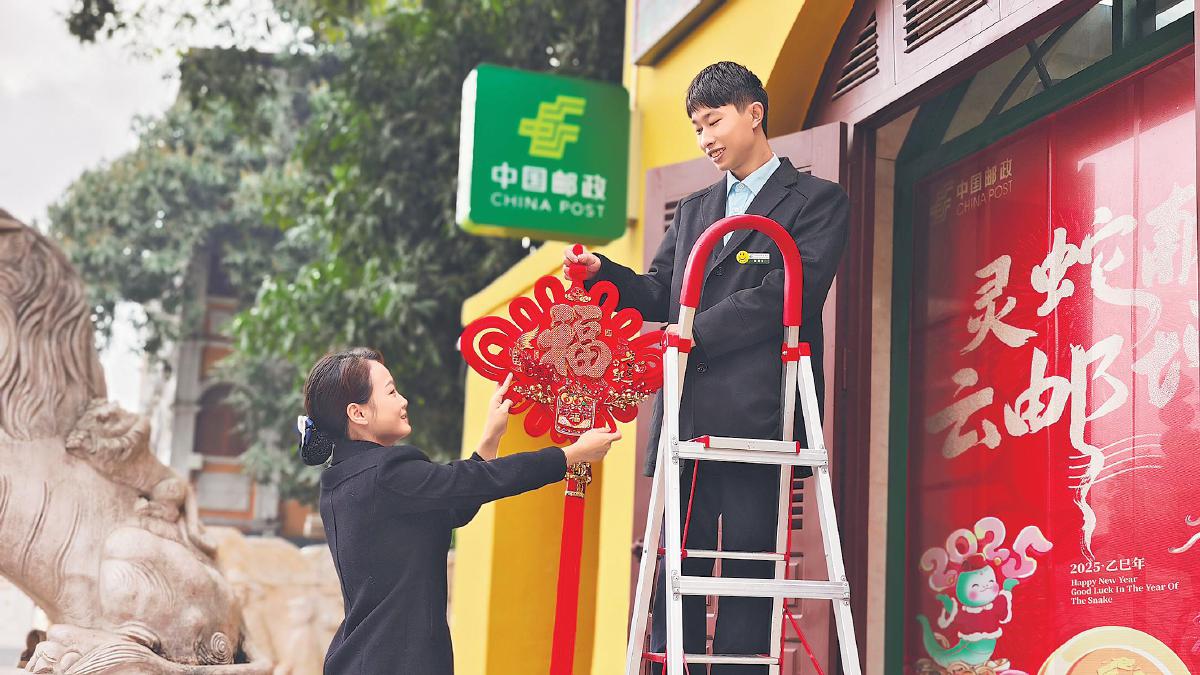 1月26日,云南省红河哈尼族彝族自治州河口县口岸邮政支局员工为支局换上新年“盛装”。□冉俊 摄
