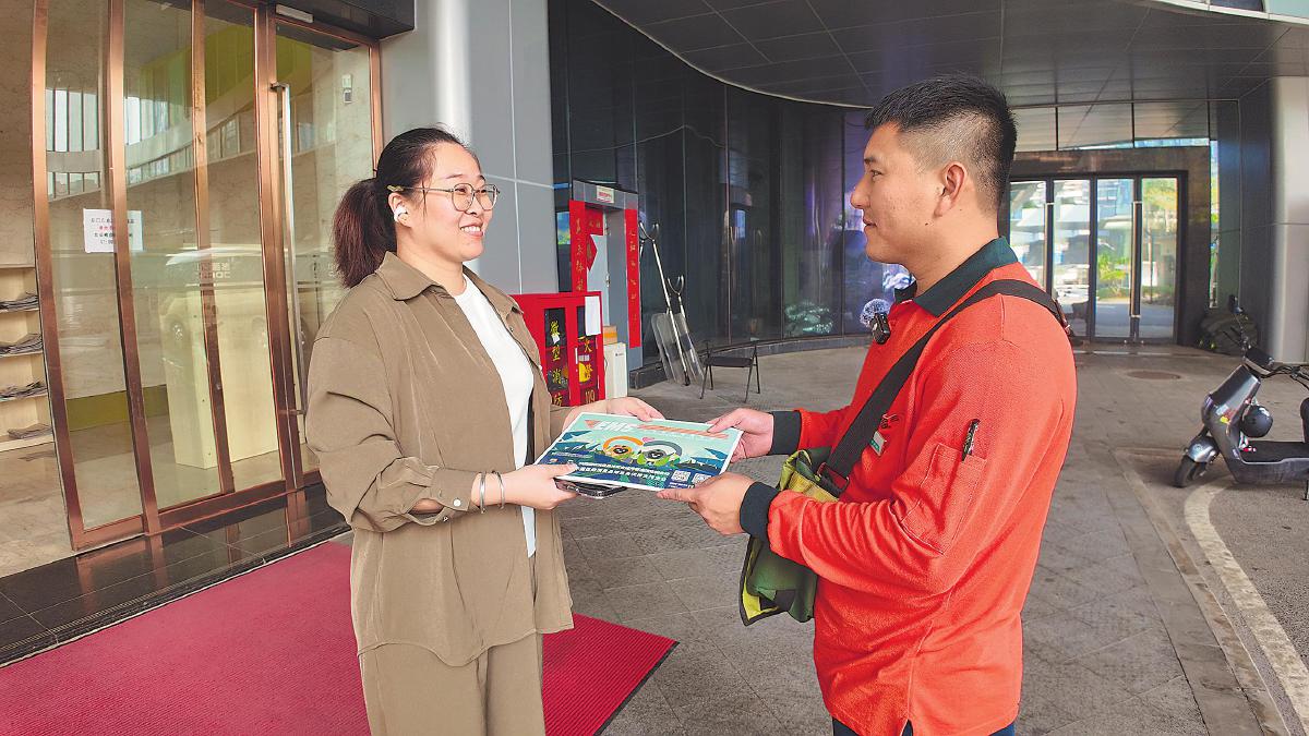 图为投递员将消博会证件邮件送交海口客户马女士。