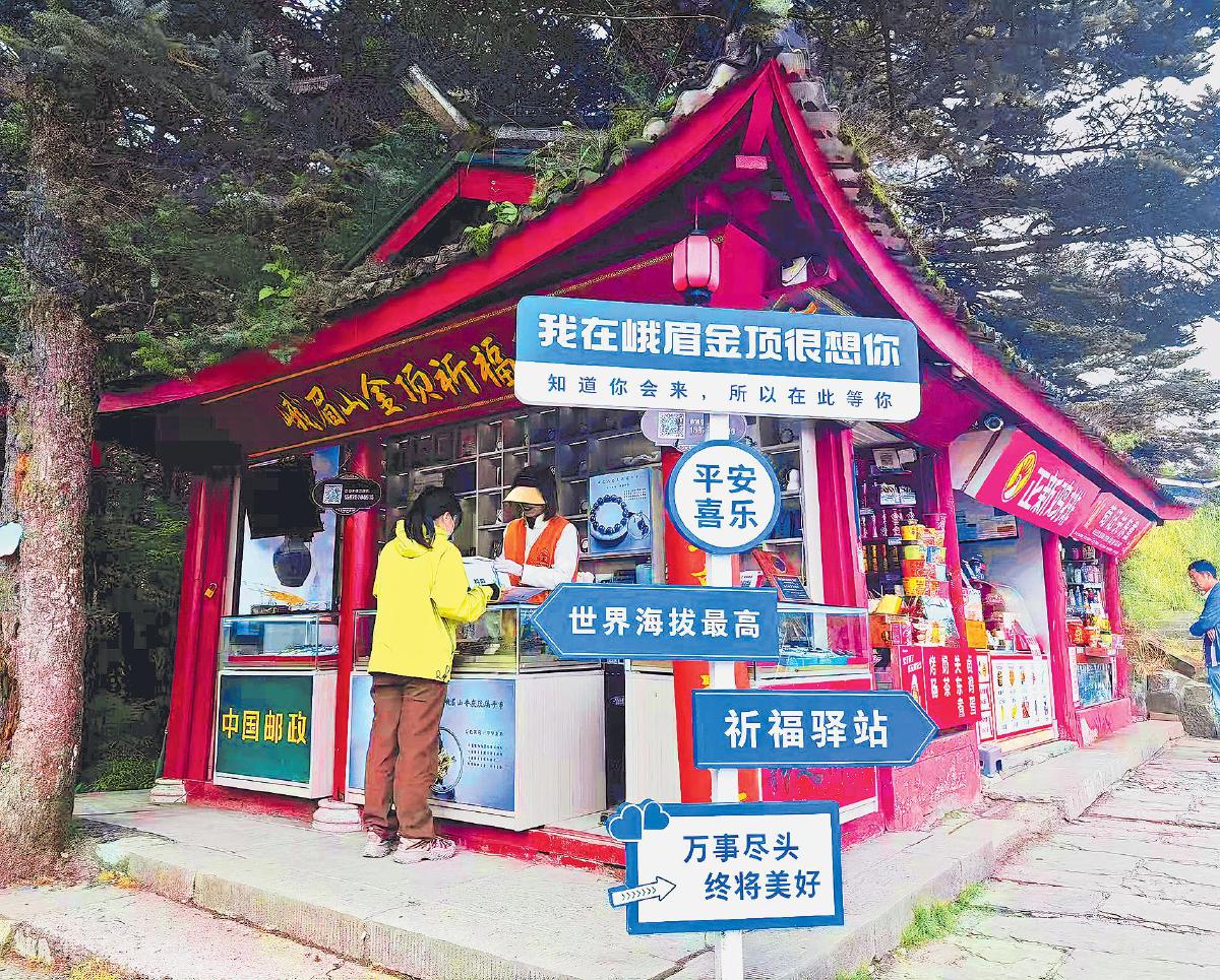 “我们不仅是一座邮局,更是祈福的驿站。”乐山市邮政分公司邮政业务部负责人徐锦介绍道。金顶祈福邮局深度挖掘峨眉山浓厚的佛教文化与壮丽的自然景观,精心设计了一系列祈福主题产品,如禅语和佛具等佛教元素纪念章、峨眉四季风光明信片……方寸之间,意境悠远,游客在寄送祝福的同时,更能感受峨眉山独特的文化底蕴和自然之美。