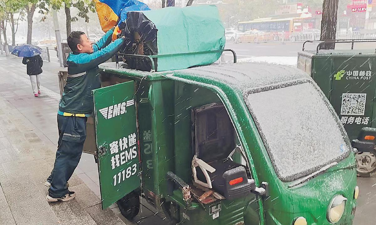 10月15日,黑龙江省哈尔滨市迎来今冬初雪,最低气温降至0摄氏度左右。风裹着雪粒打在脸上,寒气袭人。哈尔滨市邮政分公司迅速启动应急预案,加强作业调度,确保在雨雪天气情况下邮件不积压。一线揽投员克服道路湿滑等影响,主动延长投递时间,及时为客户送去包裹。这抹“冰城”初雪中的“邮政绿”生动践行着使命必达的服务承诺。