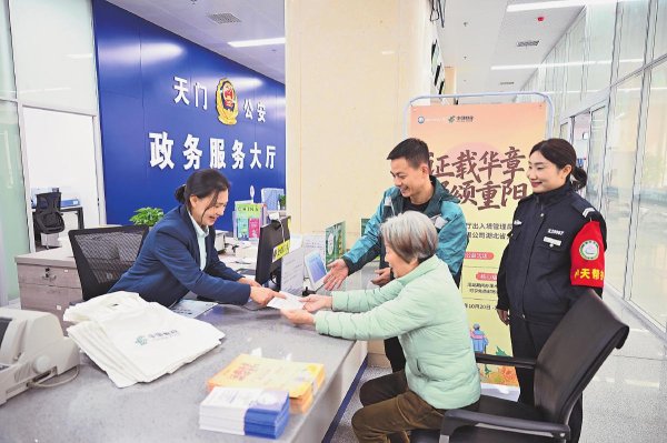 活动期间,湖北省年满60周岁的老年申请人在办理出入境证件时,均可享受“一免三优”的全流程便利服务。“一免”即提供出入境证件免费寄递到家服务,“三优”指优先取号、优先办理和优先寄递。图为天门市邮政分公司在该市政务服务中心出入境窗口设置驻点专员为老年客户提供免费寄递服务。